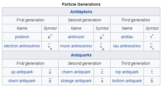 كما ويفيد النموذج القياسي لفيزياء الجسيمات أن لكل جسيم أعلاه ضدّ، فمثلا، هناك مخالف للإلكترون يسمى مخالف-الكترون أو بوزيترون وهناك ميون ومخالف-ميون وهناك تاو ومخالف-تاو، كما هو مبين في الجداول السابقة.