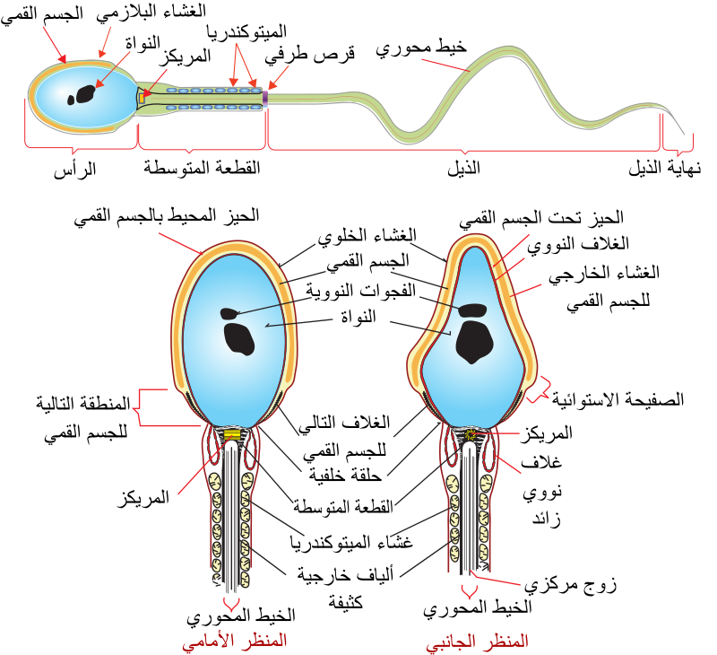 ما هو غير مرئي للعين المجرّدة هو ان كل قذفة (ما تُمنون) تحتوي على 250 – 280 مليون حيوان منوي، وكل حيوان منوي يحتوي على ثلاثة اجزاء هي الرأس، والقطعة المتوسطة والذيل كما هو موضح في لصورة التالية.